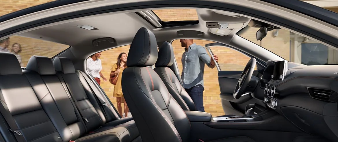 As a compact car, the new Nissan Sentra could be perfect if you need something easy to maneuver. It still has a good amount of passenger room with almost 35 inches of rear-seat legroom. The new Nissan Sentra S trim level comes standard with cloth seats and a six-way adjustable driver's seat, the new Nissan Sentra SV trim level is upgraded with premium cloth upholstery, and the new Nissan Sentra SR trim level has the most excellent package with a leather-wrapped steering wheel, heated front seats, and sport cloth upholstery with contrast stitching. Some new Nissan Sentra trim levels have quilted leather or leatherette seats. If this appeals to you, we'll help you find a model with that interior. The new Nissan Sentra also features an advanced keyless entry system that's very convenient, remote engine start, and dual-zone automatic climate control.