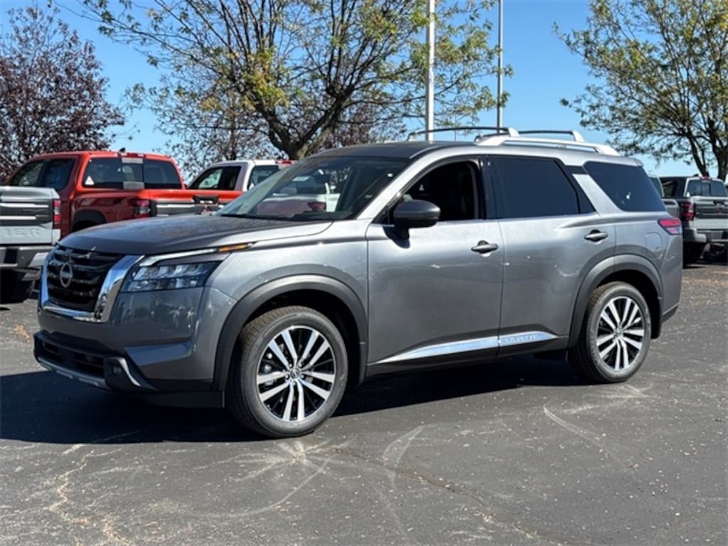 2025 Nissan Pathfinder Platinum Gun Metallic Apple CarPlay, Bluetooth, Android Auto, Heated Seats, Keyless Entry, Remote Start, Rear View Camera, Navigation, Sunroof, Touch Screen, ProPilot Assist, Cargo Area Protector, Cargo Net, Cargo Package, First Aid.